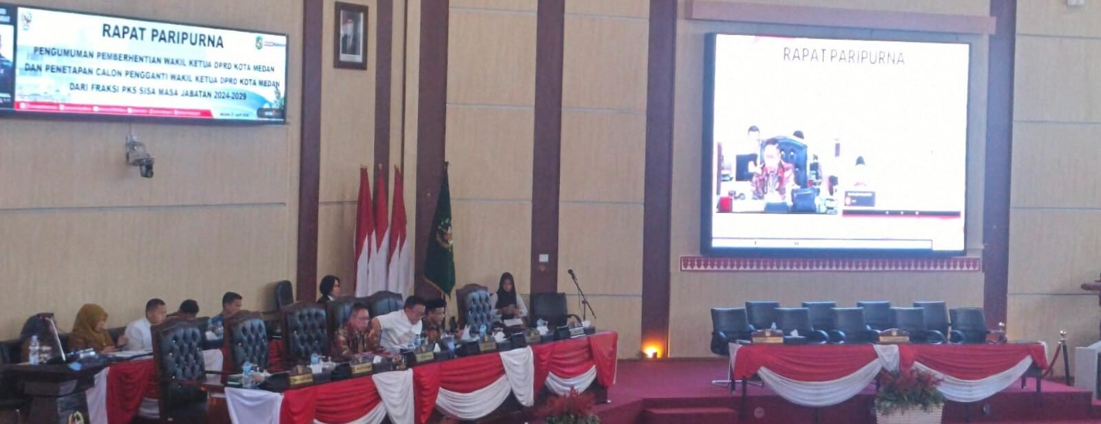 “Sesuai dengan hasil rapat badan musyawarah DPRD Kota Medan tanggal 20 april 2026 telah menetapkan jadwal rapat paripurna pada hari ini dalam acara pengumuman pemberhentian Wakil Ketua DPRD Kota Medan dan penetapan calon pengganti wakil Ketua DPRD Kota Medan dari Fraksi PKS sisa masa jabatan 2024-2029, “kata Wong mengawali sidang.