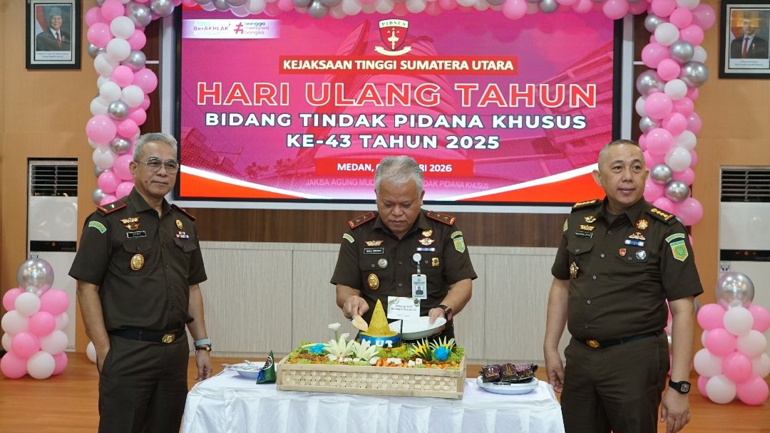 MEDAN ||  Kajati Sumatera Utara (Kajatisu) Dr Harli Siregar SH MHum bersama Wakajati Sumut Abdullah Noer Denny SH MH beserta para pejabat utama (PJU), para koordinator, kepala Seksi serta para Jaksa Penyidik maupun Jaksa Fungsional dan jajaran bidang pidana khusus Kejati Sumut, mengikuti peringatan hari ulang tahun ke-43 bidang Pidsus Kejaksaan RI tahun 2026 secara daring (zoom online), dari Aula Cipta Kerta, Lantai III Kejati Sumatera Utara, Selasa (06/01/2026).