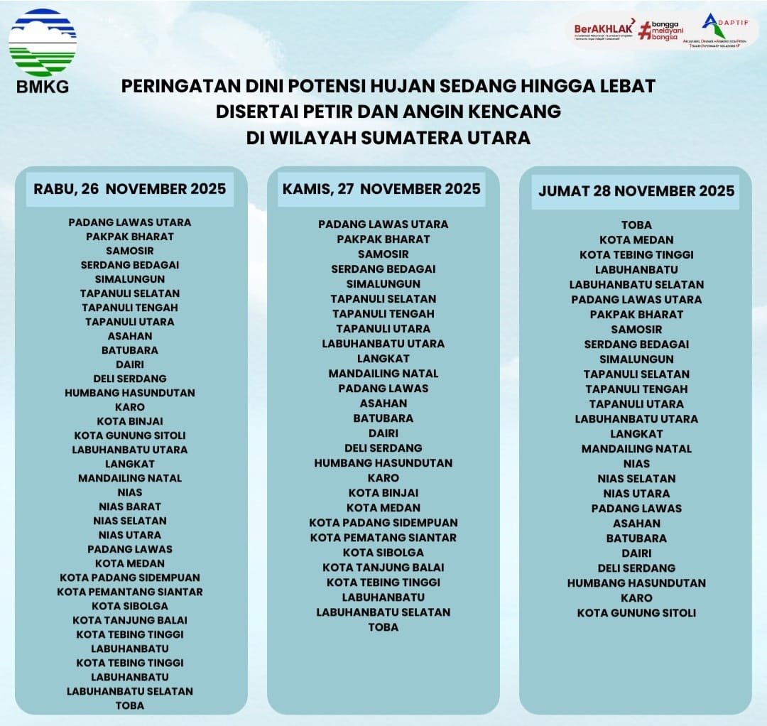 Peringatan dini potensi hujan ringan dan lembat disertai angin kencang di beberapa daerah di wilayah Provinsi Sumatera Utara.***WASGO/REL